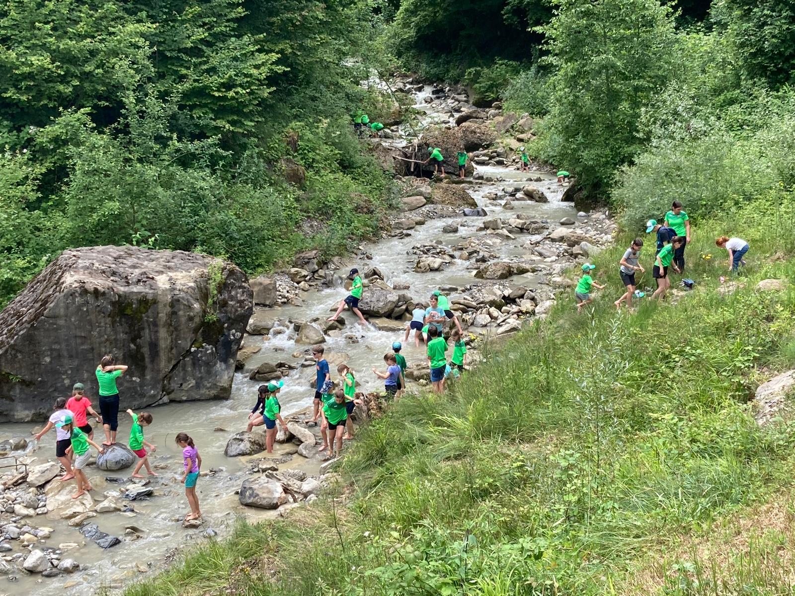 Der Weg folgte Bächen, führte uns durch den Wald und bot Abwechslung an mehreren Spielgeräten. Bei der Feuerstelle Stocken gab es die erste Pause mit Wurst, Spiel und Spass im Wald. Die zweite Pause mit Überraschungsglacé genossen die Kinder am Bach kurz vor dem Städtlein Alstätten. Mit teils nasser und auch dreckiger Kleidung stiegen wir in den Aussichtswagen der Appenzeller Bahnen. Dies war ein letztes Highlight der Jugireise 2024.